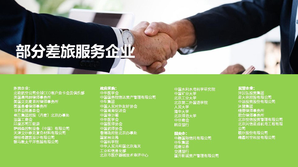 北京泓然商务旅行服务有限公司隶属于“泓然商旅”;“泓然商旅”成立于2007年,十余年来深耕于企业差旅服务(TMC),旗下拥有“北京泓然商务旅行服务有限公司”、“北京腾邦泓然国际旅行社有限公司”两家实体企业,具有超过100家中外航空公司核心机票代理授权和国内游、入境游、出境游、会议的经营许可。“泓然商旅”已成为国际航空运输协会IATA的正式会员、中国政府采购指定服务商和中国南南促进会会员,并多次荣获航空公司授予的各类奖项。我们的业务范围包括:国内国际机票、酒店预订、会议服务、公商务考察、企业团建、高端定制旅行、代办签证等,在境内外主要旅行目的地拥有完善的接待网络。